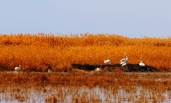 近年来,乌梁素海成了人们拍天鹅的最佳地点。随着气温的回升,乌梁素海的天鹅逐渐增多,在这里觅食,补充能量,继续北上。图为一群天鹅正在芦苇荡中休息。(摄影:陈峰)