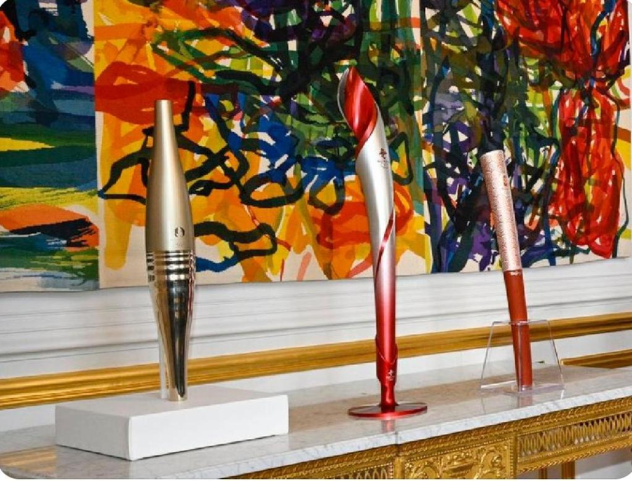 在法国爱丽舍宫一层肖像厅,三支奥运火炬并排而立,格外引人注目。这是中法两国元首夫妇互赠礼品之一。