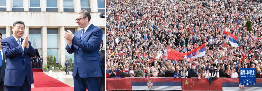 当地时间5月8日上午,国家主席习近平在贝尔格莱德塞尔维亚大厦同塞尔维亚总统武契奇举行会谈。会谈前,武契奇陪同习近平来到政府大厦平台(左图)。大厦广场上,一万五千名塞尔维亚民众挥舞中塞两国国旗,对习近平表示最热烈的欢迎(右图)。(拼版照片) 新华社记者 黄敬文 丁海涛 摄