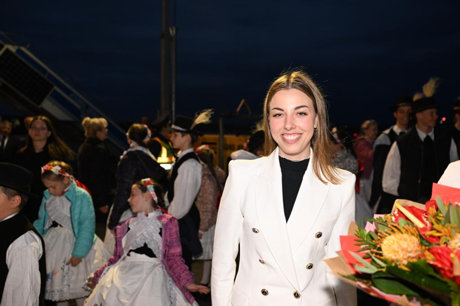 当地时间5月8日晚,在匈牙利布达佩斯国际机场欢迎队伍中的匈牙利姑娘欧拉·塔玛拉。新华社记者 谢环驰 摄